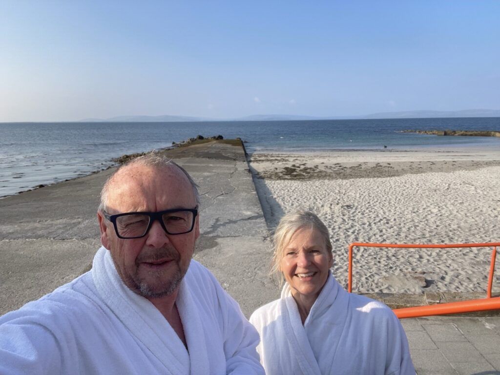 Amused staff and public alike by crossing the road to the sea for a swim in our robes. Met the Salthill dippers who swim everyday at 7