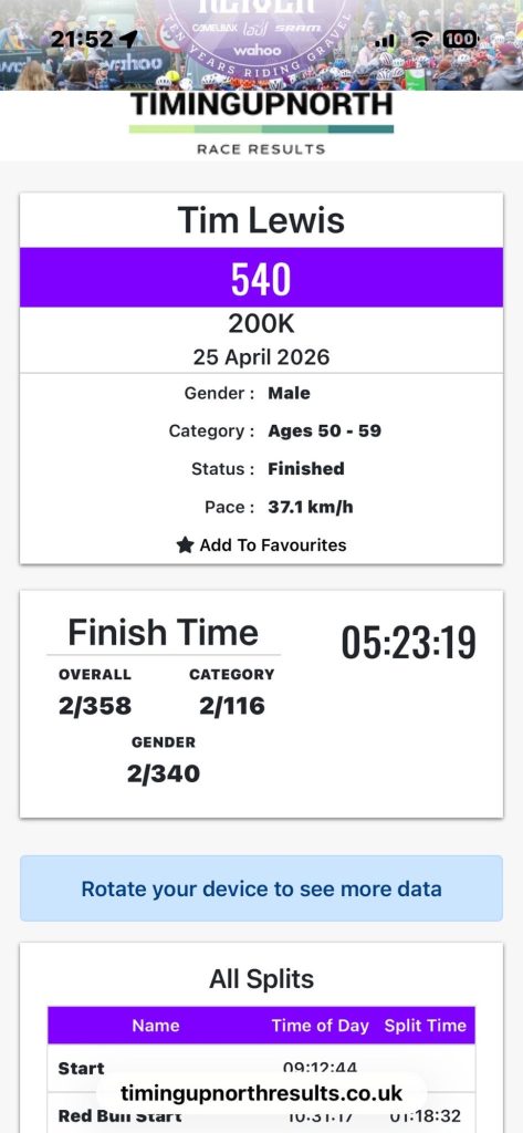 Tim naturally had gone on the 200 , but because of his diversion was now only 175. He was devastated 😉, Julie rolled in a bit later exhausted not from cycling but from chatting to anyone who would talk to her.